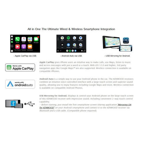 - Veikia su Apple CarPlay ir Android Auto