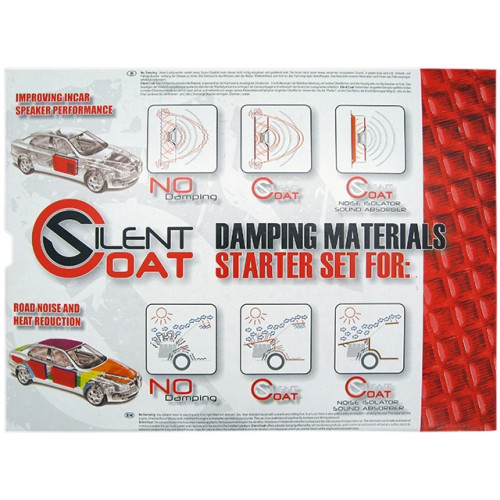 Silent Coat Starter Set – rinkinys norintiems susipažinti su vibro, garso izoliacinėmis ir garsą sugeriančiomis medžiagomis. Komplektas susideda iš 4 Silent Coat, vieno Noise Isolator 4 ir vieno Sound Absorber 15 lapo. Šis izoliacinių medžiagų komplektas puikiai tinka svarbiausių sričių aplink garsiakalbius izoliacijai bei garso skambesio kokybei automobilyje pagerinti.